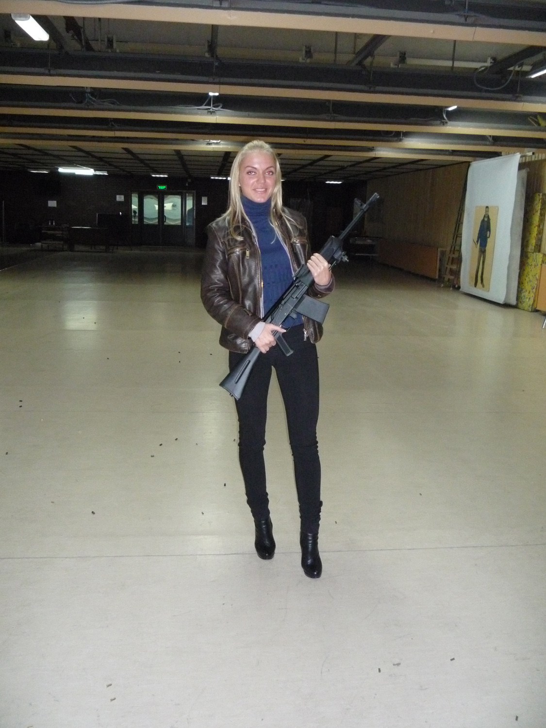 Так как время было позднее, кроме нас в тире никого не оказалось, хоть тир и круглосуточный, плюс нам попался интересный инструктор (который кстати оказался тоже геймером, познающим мир WoW), поэтому делать мы могли много чего, чего делать было нельзя. Первое — это фотосессия с оружием, которое мы просто не заказывали — Сайга. Аппарат, хочу вам сказать, что надо. Для дальних атак самый раз, жаль, что патронов к нему нам так и не дали. Естественно, какая фотоссессия могла бы быть без девушек? Пару фото имеется :)