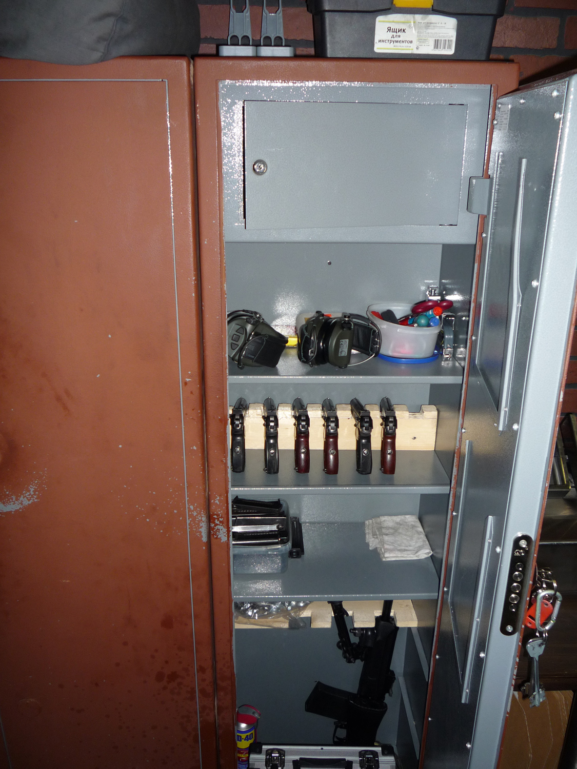 После фоток в большом зале, мы направились туда, куда должны были идти сразу — малый зал. Выглядит он как зал из фильмов про западные боевики. Все культурно, все прибрано, любота. Когда инструктор доставал оружие, мне удалось заснять весь арсенал шкафчика. Здесь нам любезно предоставили наше оружие, провели небольшой инструктаж, еще бы, патроны ведь боевые, все серьезно. Затем объяснили как правильно заряжать, передергивать, снимать с предохранителя и как держать ствол. Собственно, это не сильно помогало попадать по мишени, так как промахиваться в молоко — излюбленное дело новичков :)